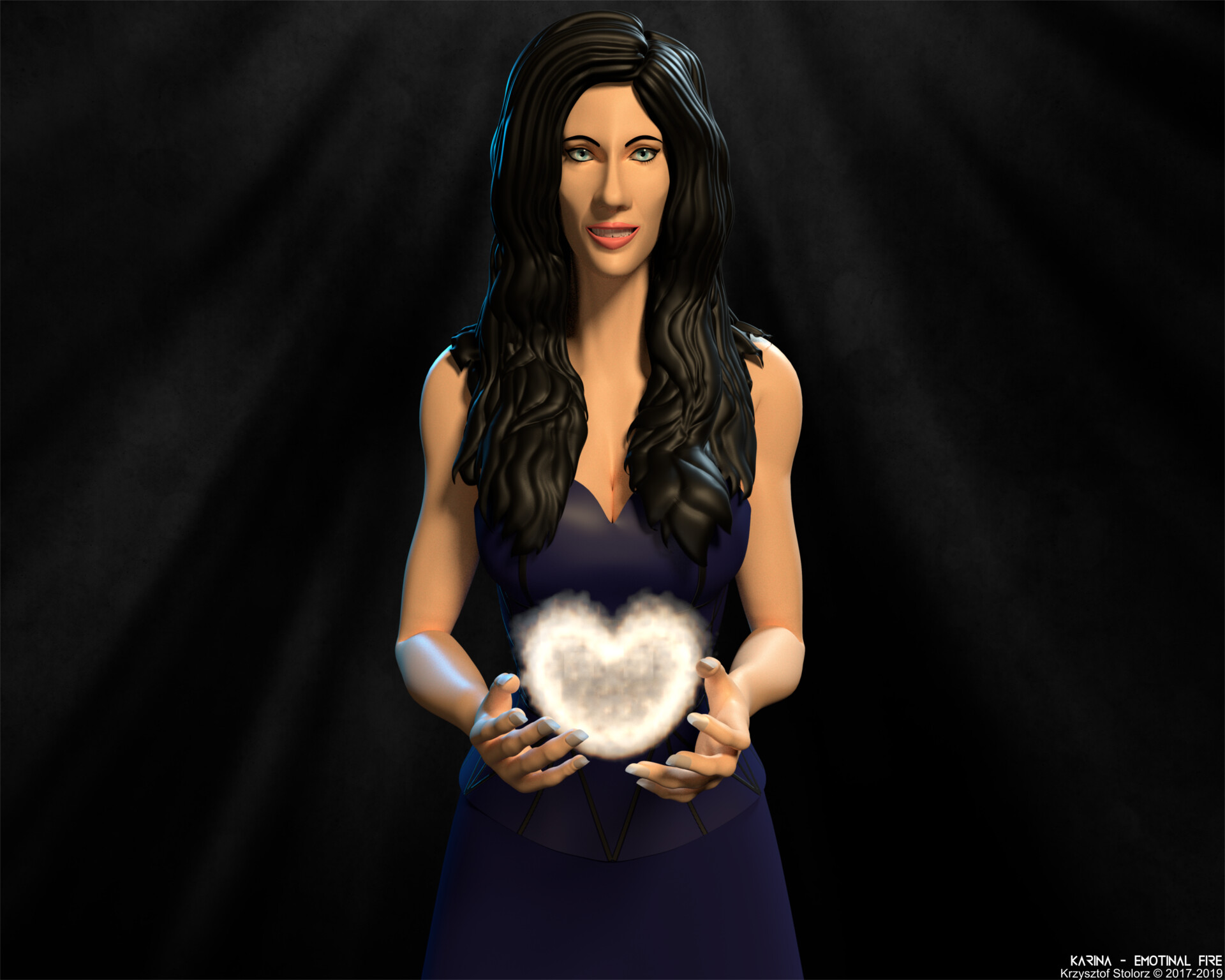Model 3D Kariny zacząłem robić w piątek 13 stycznia 2017 roku. Skąd się wziął podtytuł? Podobała mi się wtedy piosenka zespołu Sunstorm o tytule „Emotional fire” , która swoją drogą jest coverem piosenki Cher. Okładka tego albumu też mi się podobała i pełniła pewnego rodzaju inspiracje do tego projektu. Po długim czasie i wielu trudnościach opublikowałem render na DeviantArt-cie. Nie wiem kiedy to dokładnie miało miejsce, bo usunąłem tę prace po tym, jak później, 1 września 2017 zamieściłem poprawioną, aczkolwiek nadal niezbyt udaną „Wersję 2.0” .