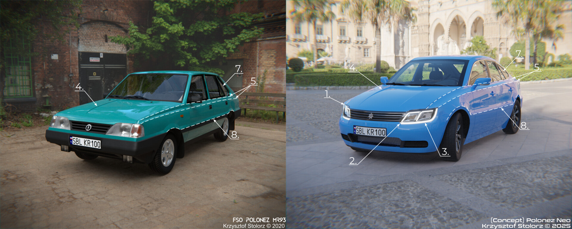 Ale załóżmy, że stałby się jakiś cud i decydenci poszliby po rozum do głowy i zaprojektowali ten samochód od podstaw. Nie wiadomo, czy upodobnił by się do samochodów niemieckich, francuskich, włoskich itd., a może (co najmniej prawdopodobne) poszedłby własną drogą. Moim głównym źródłem inspiracji były samochody koncernu VAG – głównie Volkswagen Passat i Škoda Octavia/Superb, ponieważ pierwsza generacja Poloneza była bardzo podobna do VW Passata B1. Niestety, w trakcie prac okazało się, że nieświadomie wyszło mi coś łudząco podobnego do innego modelu Volkswagena, ale o tym w dalszej części wpisu…