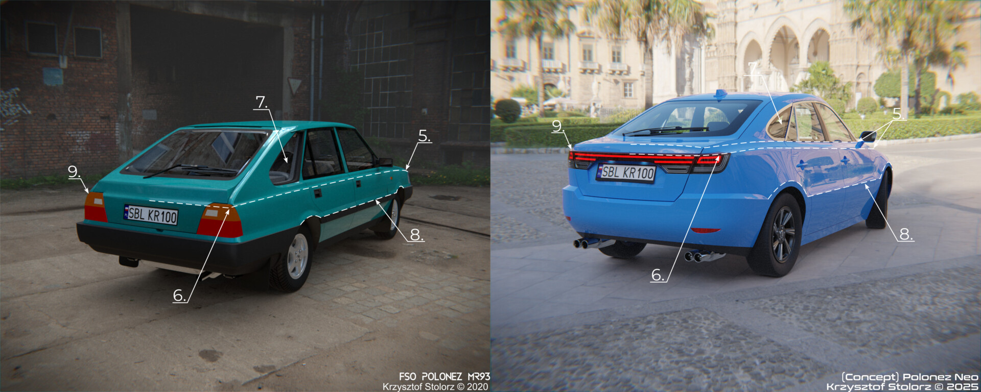 Założyłem, że chcę zrobić w miarę współczesny samochód czterodrzwiowy typu liftback. Lubię tego typu nadwozie, bo łączy w sobie elegancję sedana i funkcjonalność hatchbacka (ze względu na duży otwór załadunkowy bagażnika i wycieraczkę na tylnej szybie) i byłoby to pewnego rodzaju połączenie Poloneza Caro (hatchback) i Atu (sedan). Moje stare szkice koncepcyjne z 2020 roku nie są kompletne i przedstawiają samochód raczej z okolic 2015 roku. Można by było stworzyć jeszcze z dwie generacje pośrednie, które stanowiłyby pomost pomiędzy historycznym modelem, a moją uwspółcześnioną wizją tego pojazdu.