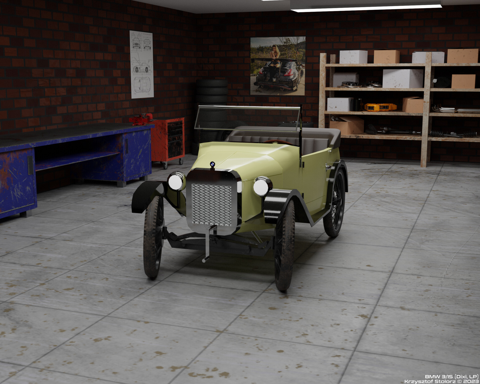BMW 3/15 Był produkowany w latach 1929-1932. Istniało kilka wersji nadwozia tego auta: sedan, kabriolet, coupe i roadster. Pierwotnie samochód był wierną kopią produkowanego w Anglii od 1922 roku Austina Seven. Do modernizacji zatrudniono francuskiego inżyniera Luciena Rosengarda. Zmiany dotyczyły w większości karoserii oraz zastosowano układ hamulcowy na wszystkie koła. Zastąpiono starą stalowo-drewnianą karoserię na nowoczesną i niespotykaną w tej klasie samochodów nitowaną karoserię, wykonaną w całości ze stali. Wykonany przeze mnie egzemplarz to dwumiejscowy kabriolet/roadster i powstał później niż 1929 – no cóż, innych planów nie miałem. Samochód posiadał rzędowy 4-cylindrowy silnik (R4) o pojemności 748,5 cm sześciennych dający 15 KM mocy przy 3000 obr/min. Napęd przekazywany był na tylną oś za pomocą 3-stopniowej, manualnej skrzyni biegów.