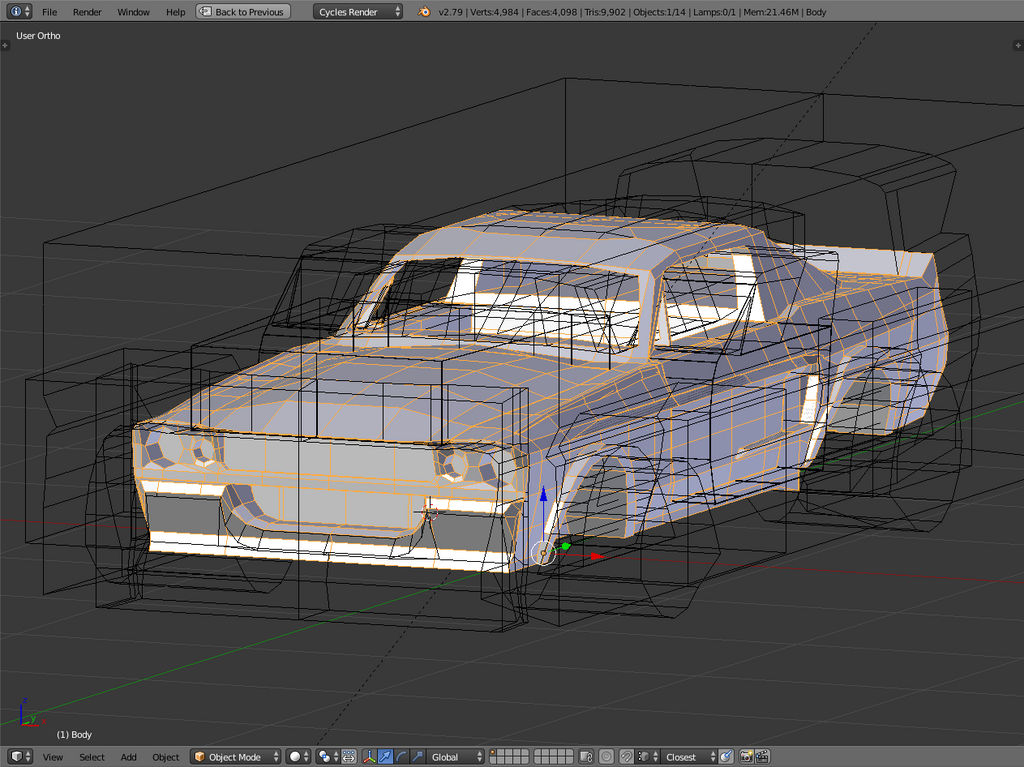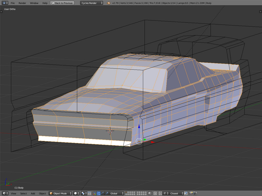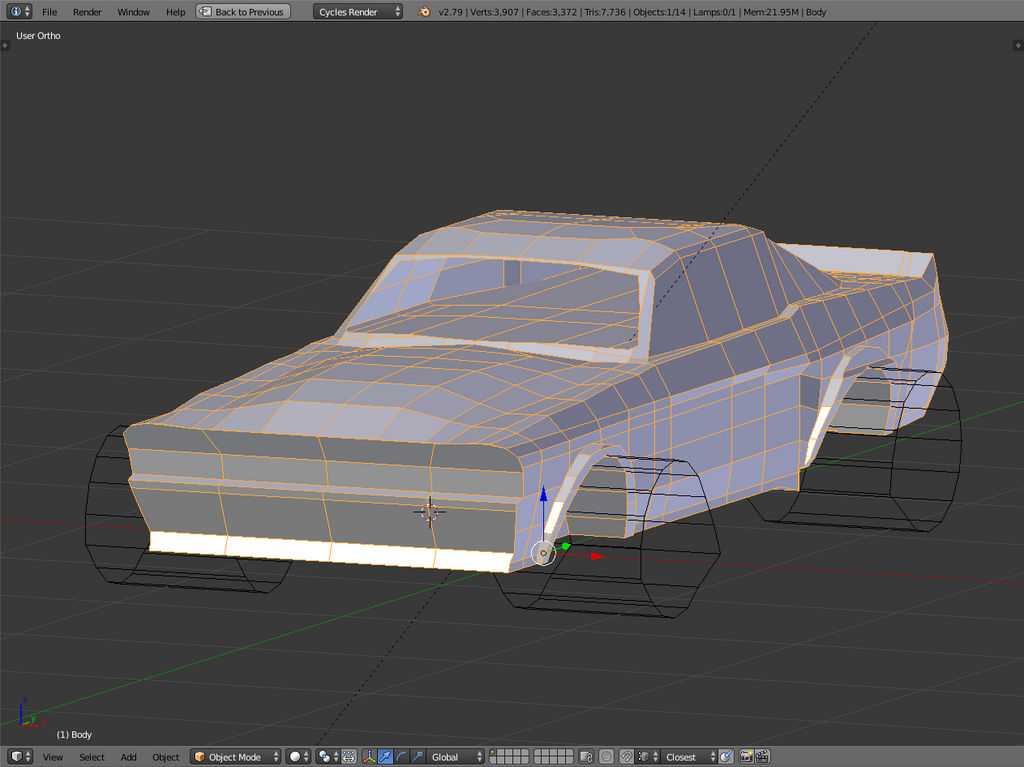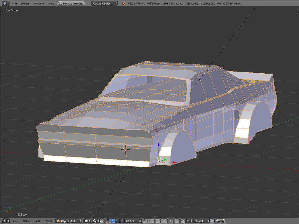 Jako, że jestem samoukiem, do wielu rzeczy musiałem dojść sam. Ten samochód bardzo dobrze ilustruje to w jaki sposób tworzyłem modele samochodów w 2019 roku. Myślałem wówczas, że wystarczy jakoś wymodelować generalny kształt auta, nie patrząc na jakąś tam topologię, a następnie wrzucić modyfikator Subdivision surface, żeby to się „wygładziło”. Oczywiście jest to bzdura, bo jeżeli topologia jest do bani, to efekt końcowy tego zabiegu też będzie do niczego, a przy okazji modyfikator dodaje od groma niepotrzebnej geometrii, obciążającej pracę sprzętu. Poprawnej topologi zacząłem się uczyć dopiero w 2020 roku, tworząc modele low-poly, gdzie poprawne rozłożenie siatki było kluczowe.