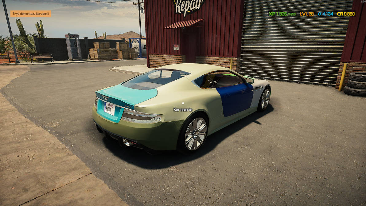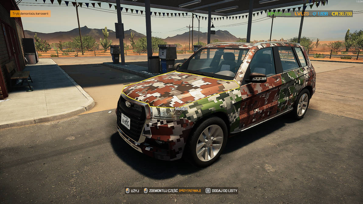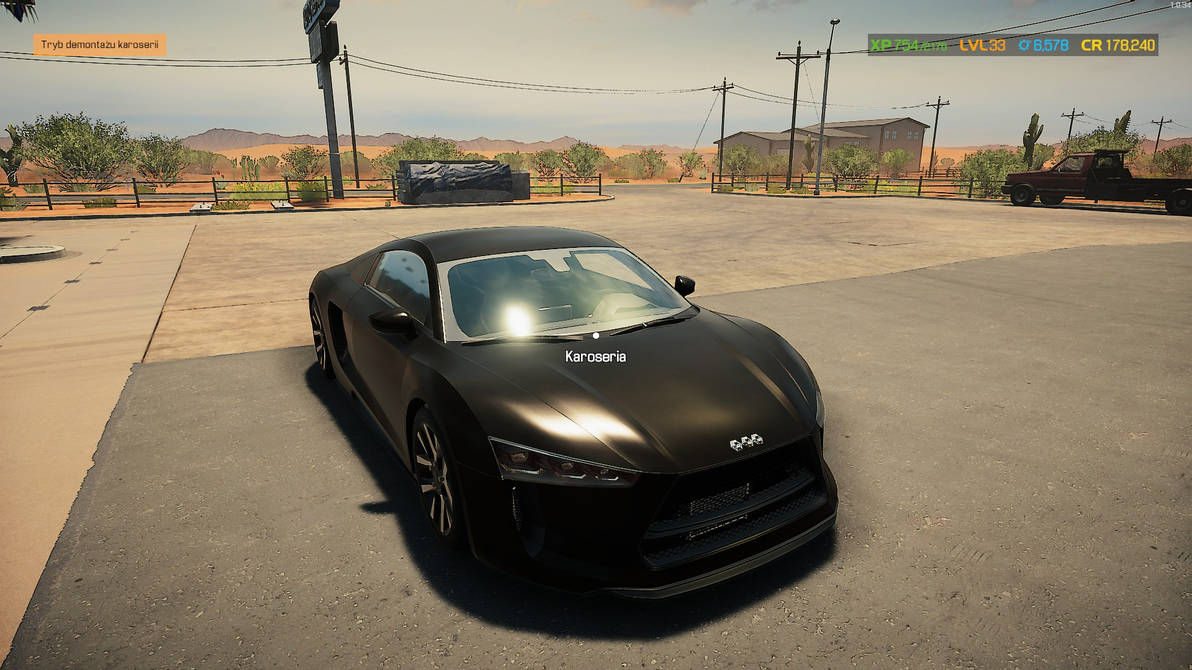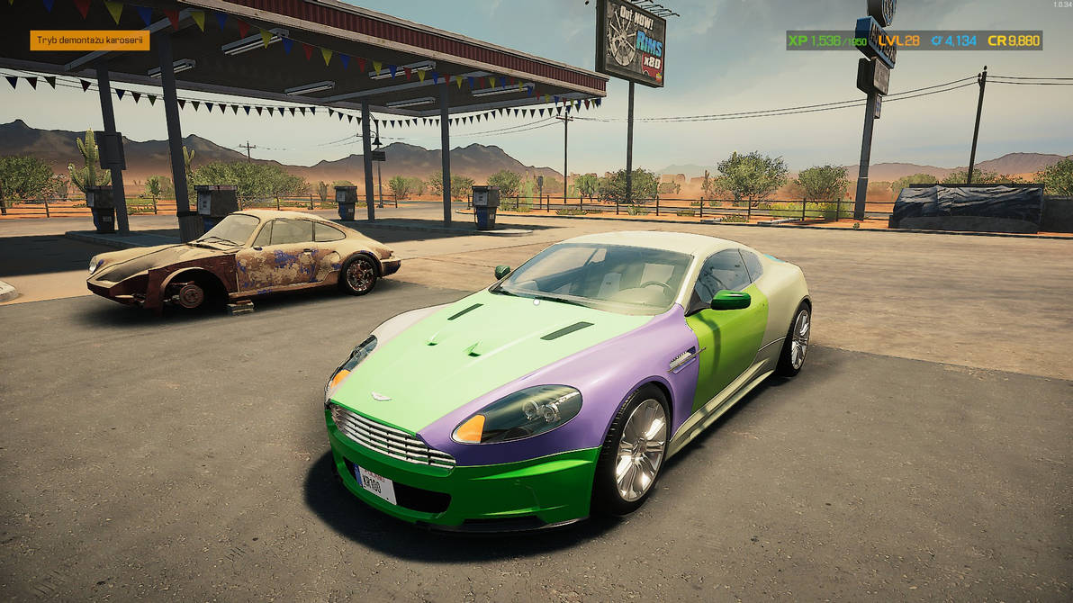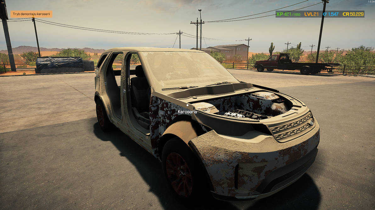 Opiszę teraz kilka różnic. Otóż istnieje świat poza garażem – jest ograniczony ogrodzeniem i niewidoczną barierą uniemożliwiającą wyjście na ruchliwą Route 66, ale zawsze lepsze to niż tylko zamknięta przestrzeń warsztatu (w CMS 2018, opisywanym wcześniej, wszystko było zawarte w zwartej przestrzeni garażu). Drzewko umiejętności posiada tylko umiejętności, a rozbudowę i osprzęt kupuje się za pieniądze. Naprawy części wymagają refleksu – zabawa polega na tym, że ukazuje się nam pasek, wskaźnik przesuwa się w lewo i prawo, i trzeba trafić gdy znajduje się nad zielonymi polami, czerwone to porażka. Rozwój odpowiednich umiejętności zwiększa prawdopodobieństwo natychmiastowej naprawy. Do gry dodano zardzewiałe, zapieczone śruby, które trzeba spryskać środkiem DW-40 🙂